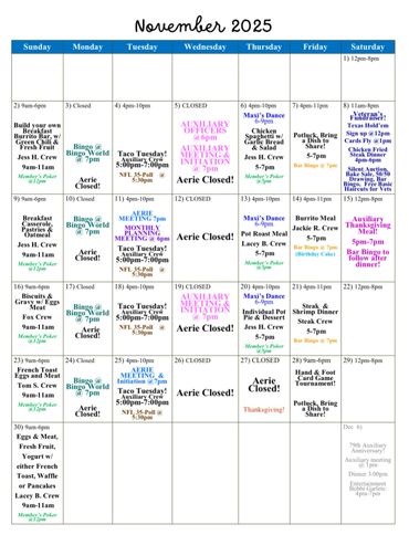 Every 2nd Tuesday for the Aerie Meeting at 7pm, we offer a good meal for our members from 5pm-7pm.